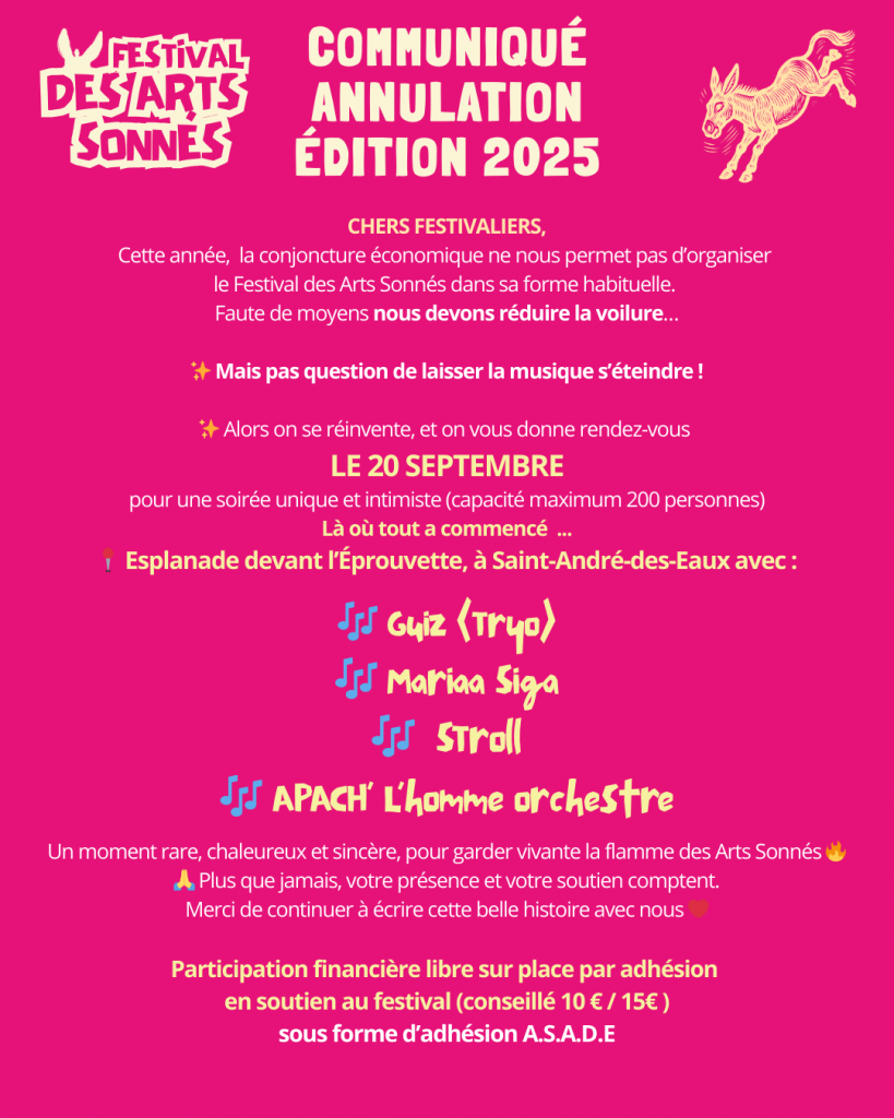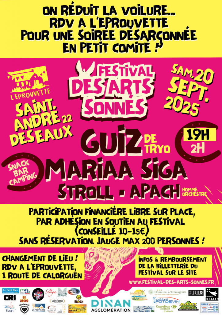 Depuis 2010, le festival Des Arts Sonnés résonne dans le pays de Dinan, et fait se rencontrer des artistes francophones d’envergure nationales et locales, dans un cadre joyeux, festif et décomplexé. Pour cette édition 2025, le festival fait son grand retour sur ses terres historiques, à Saint-André-des-Eaux ! Rendez-vous devant l’esplanade de la salle des fêtes pour une soirée de joie et de musiques !!